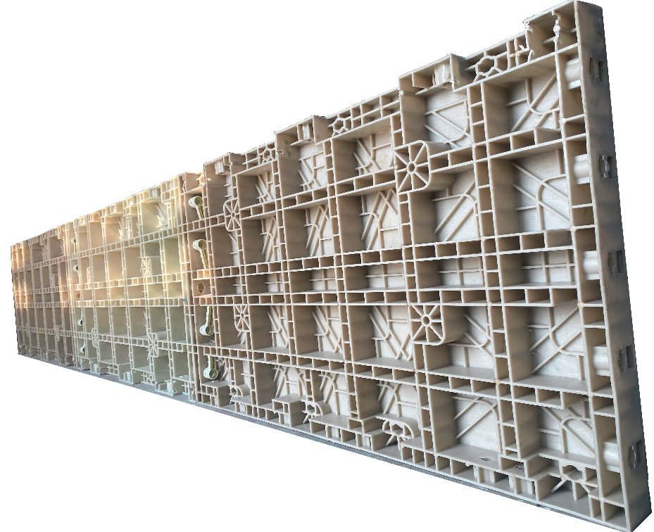 高分子塑料帶肋模板:以聚丙烯塑料為主要原材料,采用壓塑或注塑工藝制成的具有滿足設計技術性能及規(guī)格尺寸要求的板狀部件,是拼裝式模具梁、柱部位主要組成單元。具有無毒無味可回收循環(huán)利用等特點。其常用規(guī)格尺寸如下: